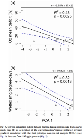 分解速率:污染河段Wettex分解速率達5.45 mg/度日(vs. 原始河段0.12 mg/度日),與營養鹽負荷正相關(R2=0.82, p=0.001;圖4b)。