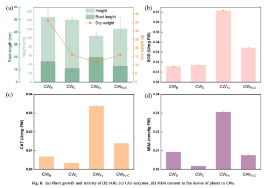 植物毒性降低:生物炭減少60%鐵用量,顯著緩解Fe對(duì)鳶尾(Iris wilsonii)的氧化脅迫(SOD活性↓29.5%,圖8b-d)。