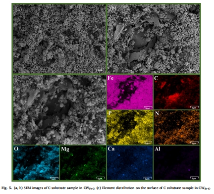 SEM-EDS顯示生物炭表面富集Fe、Ca、Al氧化物(圖5c)。
