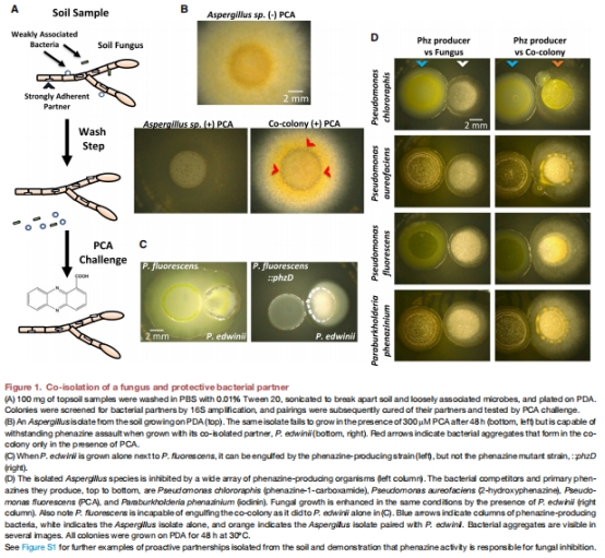 物理共生對的形成:從土壤中分離出真菌-細(xì)菌共生對,真菌在缺乏細(xì)菌時對PCA敏感(抑制濃度>300 μM),而細(xì)菌存在時真菌生長恢復(fù)(圖1B)。