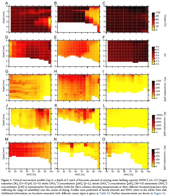 pH:70% WHC時達峰值(8.4),干燥時降至7.6(圖4B, 6B)。