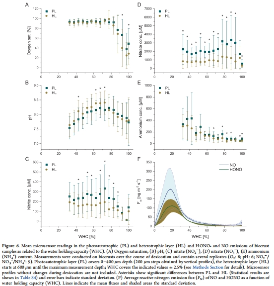 NO??:70% WHC時濃度最高(PL層350 μM),與HONO排放負相關(圖6C,F)。