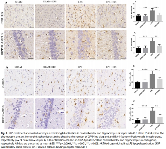 皮質GFAP+細胞:LPS組41.2±3.8 → HRS組22.5±2.1(p<0.001)。