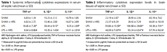 腦組織IL-10:LPS組38.38±7.91 pg/mL → HRS組57.74±9.62 pg/mL(p<0.05)。