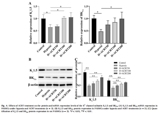 本研究探討了紅景天活性成分(ACRT) 對(duì)缺氧誘導(dǎo)的大鼠肺動(dòng)脈平滑肌細(xì)胞(PASMCs)鉀通道抑制的修復(fù)作用及其抗增殖機(jī)制。核心發(fā)現(xiàn)包括: