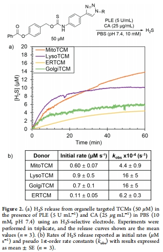本文開(kāi)發(fā)了首個(gè)亞細(xì)胞器靶向的硫化氫(H?S)供體庫(kù),通過(guò)將高爾基體、溶酶體、內(nèi)質(zhì)網(wǎng)(ER)和線粒體的靶向基團(tuán)與硫代氨基甲酸酯(TCM)支架結(jié)合(圖1b),實(shí)現(xiàn)了H?S在特定細(xì)胞器的定位釋放。