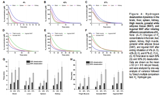 脫飽和曲線顯示脂肪組織氫氣清除延遲(圖4F),提示其作為氫氣"儲庫"的潛在價值。