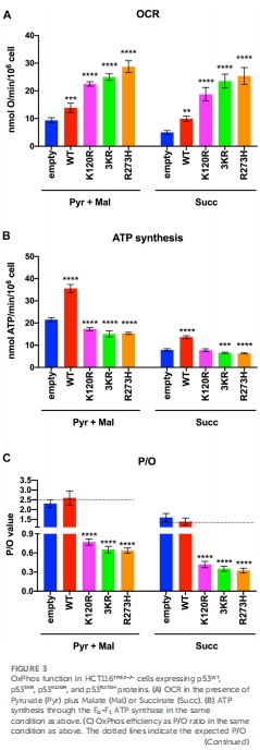 OCR:p53K120R細胞OCR為p53WT的2倍,但ATP合成僅50%(圖3A-B),表明 呼吸解偶聯(P/O比降低)。