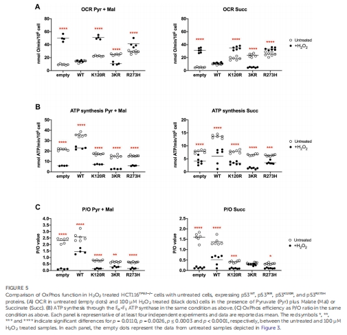 H?O?處理后,p53K120R細胞OCR驟升60%,ATP合成反降30%(圖5),表明 氧化應激加劇解偶聯。