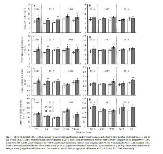 eCO?提高強響應品種的生物量(地上+20%,地下+18%)和分蘗數(圖1c,e,g)。