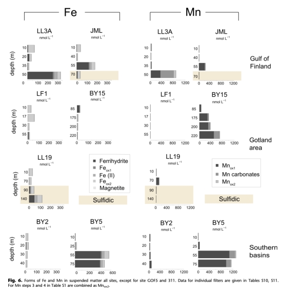 ? 數據:季節性缺氧區釋放最高(Fe: 2.6 mmol/m2/d, Mn: 15.3 mmol/m2/d)
