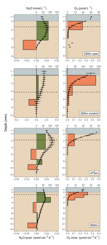 1. 高分辨率機制解析:首次在亞毫米尺度捕捉沉積物孔隙水N?O峰值位置(圖2),明確其與O?消耗區(硝化作用帶)及亞氧區(部分反硝化)的空間耦合,揭示低氧環境下N?O產生與氧動力學的直接關聯。