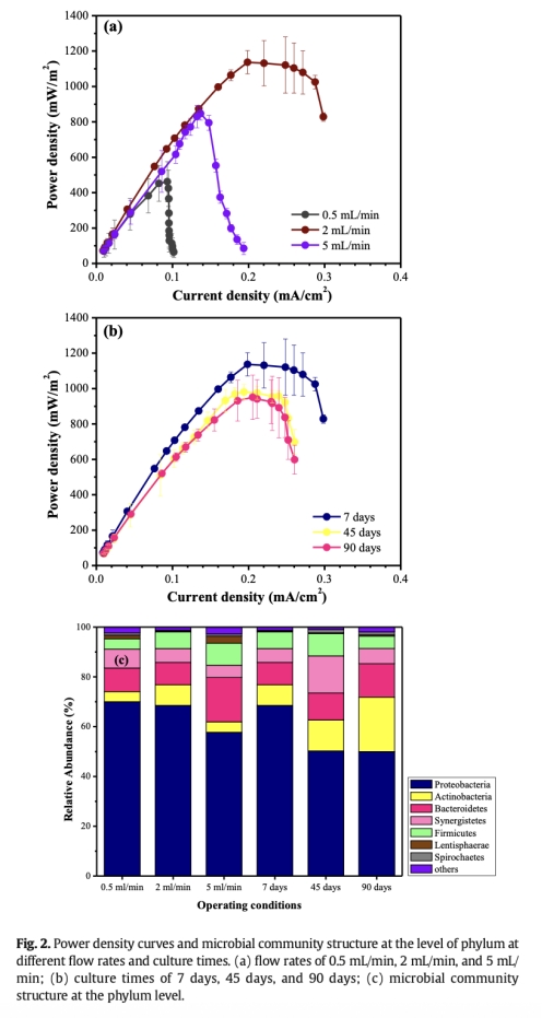 ? 數據:2 mL/min時功率密度達1137.0±65.5 mW/m2,90天降至950.8±125.1 mW/m2
