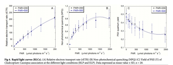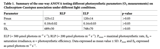 ? 揭示即使光強倍增(200→500 μmol photons),水母的碳固定效率不變(Pmax無差異),推翻"高光需代謝調(diào)整"假設。