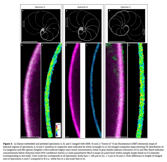 ? 同步輻射XRF繪制殼體Mn/Ca空間分布(圖4)。