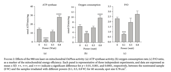 1. 靶向性調(diào)控:980nm激光特異性激活線粒體復(fù)合物III和IV,且存在功率依賴(lài)性"窗口效應(yīng)"(0.8W最佳)。