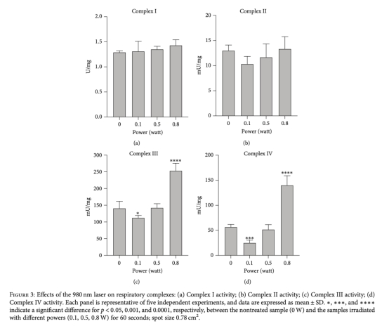 研究首次證明980nm激光可調(diào)控牛肝線粒體呼吸鏈復(fù)合物III和IV的活性,并影響ATP合成與氧化應(yīng)激水平。低功率(0.1–0.2W)抑制ATP合成并誘發(fā)呼吸鏈解耦聯(lián);中功率(0.3–0.7W)無(wú)顯著效應(yīng);高功率(0.8–1.1W)通過(guò)激活復(fù)合物III和IV提升ATP產(chǎn)量(圖1)。1.2–1.4W時(shí)ATP恢復(fù)至基線水平。激光還通過(guò)增加氧耗(圖2b)誘導(dǎo)活性氧(ROS)積累和脂質(zhì)過(guò)氧化(圖5),但未影響三羧酸循環(huán)酶活性(圖4)。