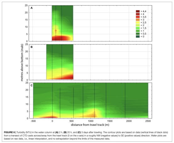 ? 數據:拖網后2小時濁度峰值4.3 NTU(距軌跡550米),懸浮物擴散>1公里