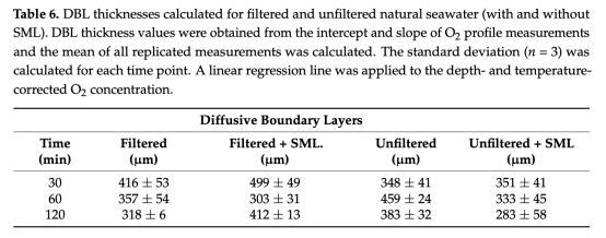 ? 數(shù)據(jù):DBL厚度在添加SML后增至499μm(過濾海水)和283μm(未過濾海水);人工表面活性劑使DBL增厚30%(Triton-X-100)和26%(油醇)。