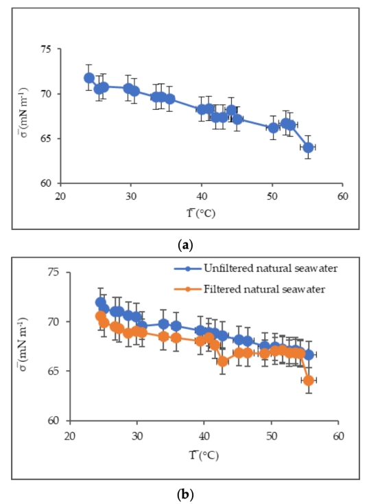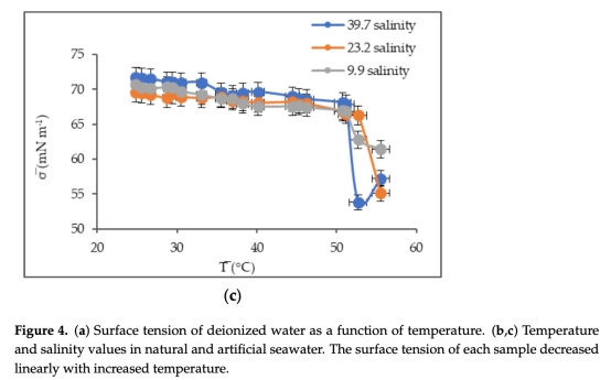 ? 數(shù)據(jù):溫度升高(24°C→55°C)使去離子水表面張力從72降至64 mN m?1;人工表面活性劑(2000μg L?1)使張力降至48 mN m?1(Triton-X-100)和38 mN m?1(油醇)。
