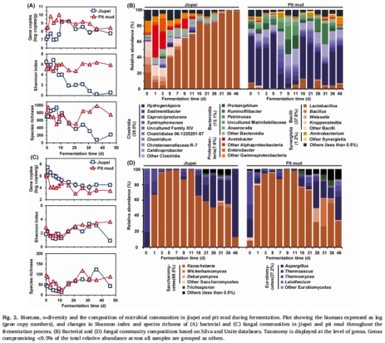 細菌主導:細菌生物量是真菌的100倍(酒醅)至10,000倍(窖泥)(圖2A)。