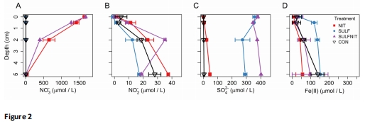 設置4種處理:對照(CON)、加硝酸鹽(NIT)、加硫酸鹽(SULF)、混合添加(SULFNIT),持續40天。