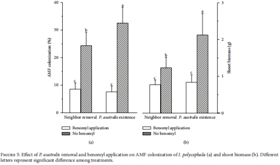 結果:蘆葦存在時AMF定殖率提高40%,生物量增加48%