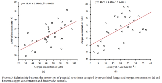 AMF的氧氣依賴性:淹水濕地中AMF定殖率與土壤氧氣濃度顯著正相關(圖3a),蘆葦(Phragmites australis)通過通氣組織提高根際氧氣濃度(圖3b),促進AMF定殖(圖4)。