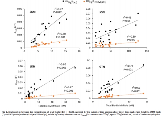 硫醇與甲基化正相關:特定生物源低分子量硫醇(如半胱氨酸、谷胱甘肽)的濃度與k??顯著正相關(圖3),暗示微生物活動驅動甲基化。
