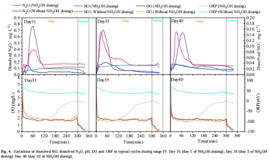 數(shù)據(jù):投加羥胺后,溶解NO峰值達(dá)0.15 mg·L?1(圖4),N?O排放比降至0.96%(表3)。