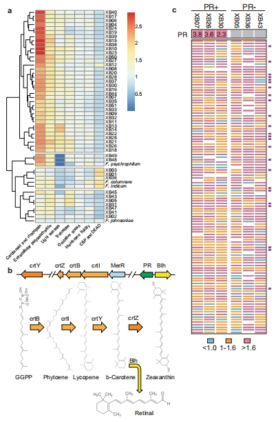 基因組測序:47株全基因組測序,鑒定prd(視紫紅質基因)和crtIBZY(玉米黃質合成基因簇)(圖5a,b)。