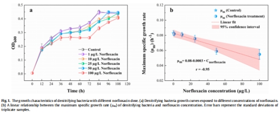 結果:100 μg/L諾氟沙星使μm從0.083 h?1降至0.055 h?1(r = -0.95)。