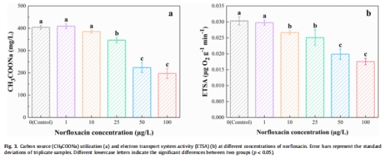 結果:100 μg/L諾氟沙星使碳源利用降低35.1%,ETSA降低43.3%。