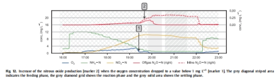 技術亮點:結合 液相N?O傳感器(Unisense) 與尾氣分析,首次揭示AGS工藝中N?O動態產生/消耗機制(圖11)。