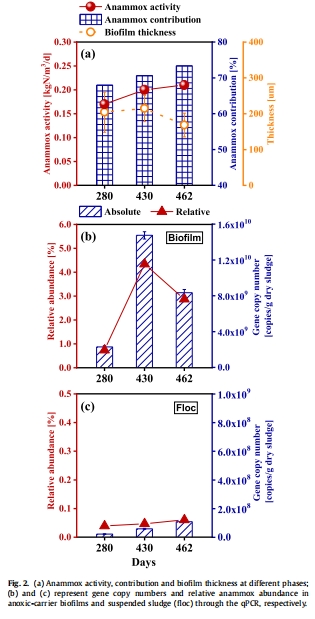 數據:缺氧生物膜中anammox豐度達4.34%(qPCR),貢獻68%-73.4%的脫氮(批次測試)。