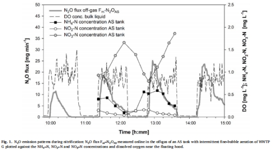 硝化是N?O主要來源:好氧階段N?O排放與進水氨氮(NH??)負(fù)荷峰值正相關(guān)(圖1-2),尤其在NH??濃度升高時排放激增。