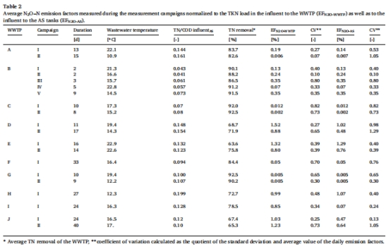 脫氮效率與排放負(fù)相關(guān):TN去除率≥83%的廠(如B、C、G廠)N?O排放強度最低(0.0012±0.001 kg N?O-N/kg TKN),而低脫氮率廠(如D、J廠)排放因子高達1.52%(表2)。
