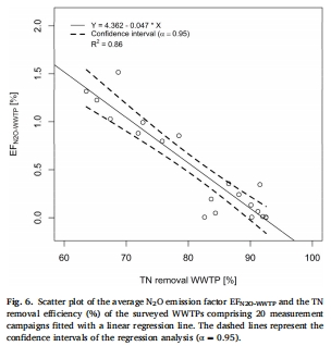 多元線性回歸:關(guān)聯(lián)EF<sub>N?O-WWTP</sub>與TN去除率、進水TN/COD比、水溫等參數(shù)(R軟件平臺)。