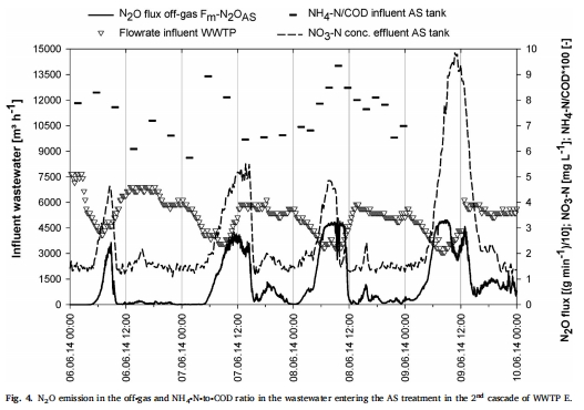 NH??/COD比升高時(如早高峰),反硝化抑制導(dǎo)致N?O排放激增(圖4)。
