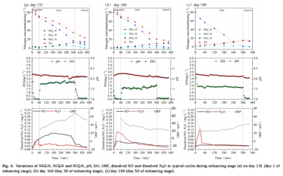 強化期曝氣倍增導致NO短暫升高(0.065 mg·L?1,圖4a),協(xié)同重建后回落(圖4b-c),證明NO動態(tài)可反映功能菌平衡狀態(tài)。