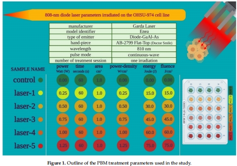 本研究通過808 nm光生物調節(PBM)處理人頭頸鱗狀細胞癌(HNSCC)細胞系(OHSU-974 FAcorr),發現: