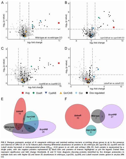 蛋白組學特征:37個差異蛋白(僅占全蛋白組的0.56%),包括部分dos調節子(如DosR上調5倍),但dos調節子缺失(ΔdosR)不影響CO耐受性(圖2)。