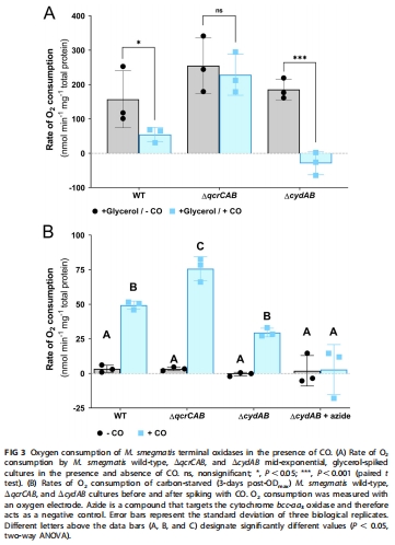 低濃度可作為能源(經CO脫氫酶)耦合bd氧化酶維持呼吸(圖3B)。