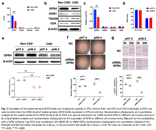 GPR4表達差異:GPR4是EPCs中表達最高的質子感應GPCR,其表達在CAD患者EPCs中顯著低于健康人(圖3d-e);