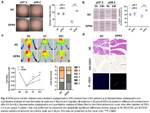 體內:移植GPR4過表達EPCs的小鼠后肢血流恢復率↑80%(圖4c-d);