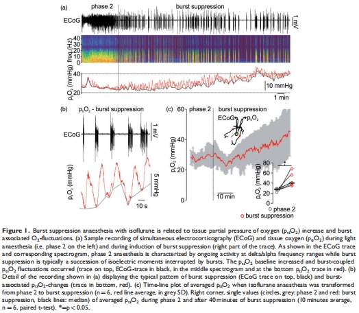 腦組織氧分壓(p??O?):爆發抑制期p??O?顯著升高(40.2 vs. 27.8 mmHg,p=0.02),伴隨爆發相關的局部p??O?波動(圖1)。
