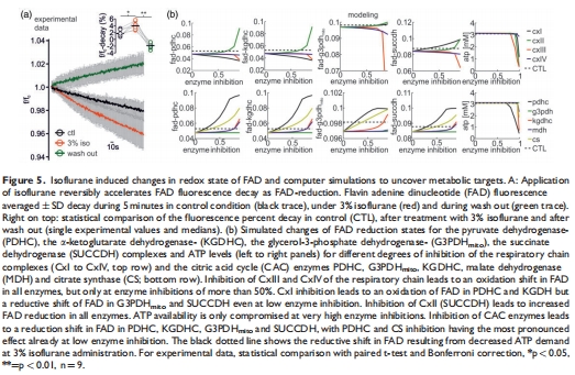 FAD還原性偏移:3%異氟醚加速FAD熒光衰減(4.3% vs. 1.7%),提示線粒體還原態增強(圖5a)。