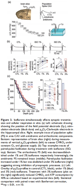 突觸傳遞抑制:3%異氟醚使正交群峰電位(PS)↓89%(-0.26 vs. -2.3 mV),配對脈沖易化(PPR)消失(圖3b)。