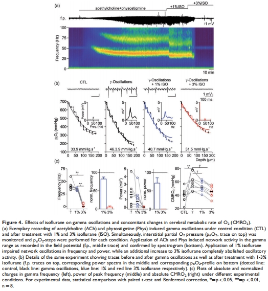 CMRO?降低:腦片CMRO?↓17%(31.2 vs. 37.7 mmHg·s?1,p=0.004),γ振蕩幾乎消失(圖4)。