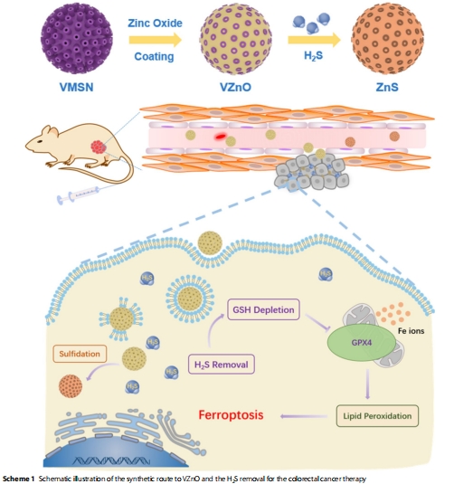 本研究開發了一種硫化氫(H?S)響應型納米平臺(VZnO),通過清除結直腸癌(CRC)中高表達的H?S誘導癌細胞鐵死亡。關鍵發現: